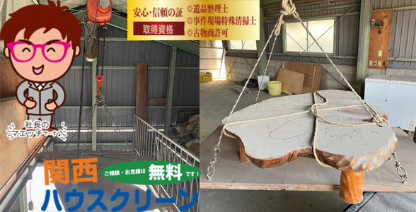 二階建ての農業倉庫片付けで岩出市へ 約60〜70kgの屋久杉の一枚板テーブルも時がたてば不要に