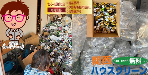 ゴミ屋敷清掃で岩出市へ 先ずは玄関に大量に散乱したペットボトル ラベルとキャップを外して、完全リサイクル計画